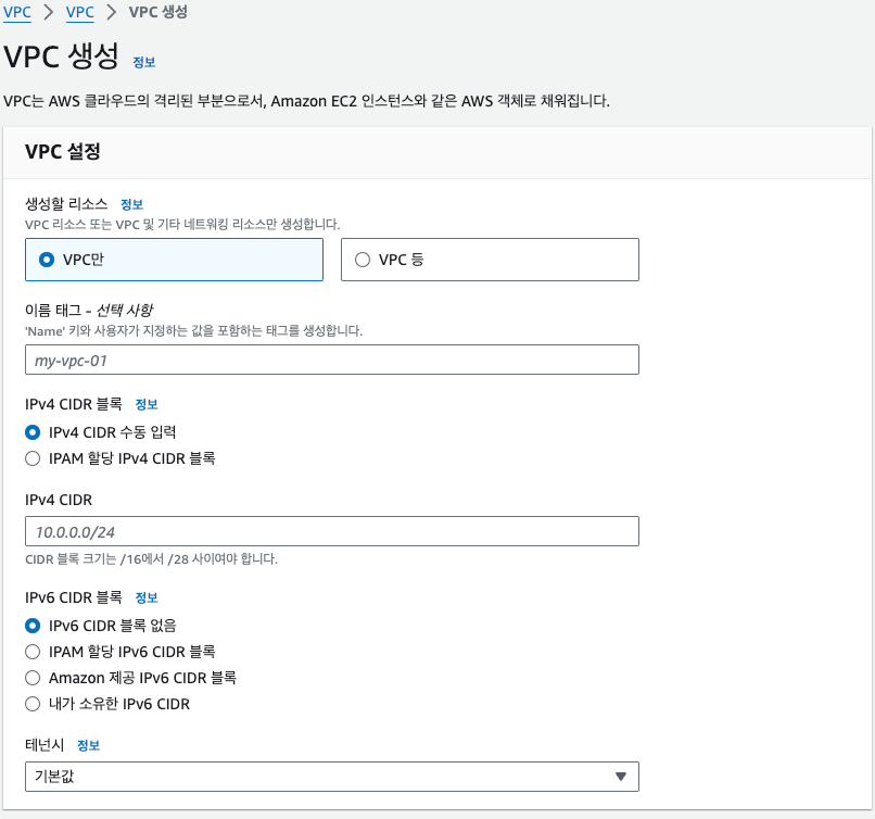 VPC를 먼저 생성하는 것으로부터 시작해 보자. VPC를 생성하는 것은 크게 어렵지 않은 내용이다. "VPC > VPC > VPC 생성"으로 이동해 요구하는 설정을 채워주자.