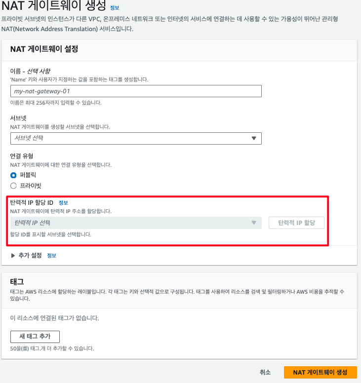 Public Nate Gateway는 Private Nat Gateway를 생성하는 것과 차이가 있다. "EIP"를 할당해줘야 하는 것인데 EIP가 없다면 생성해서 할당해 주자.