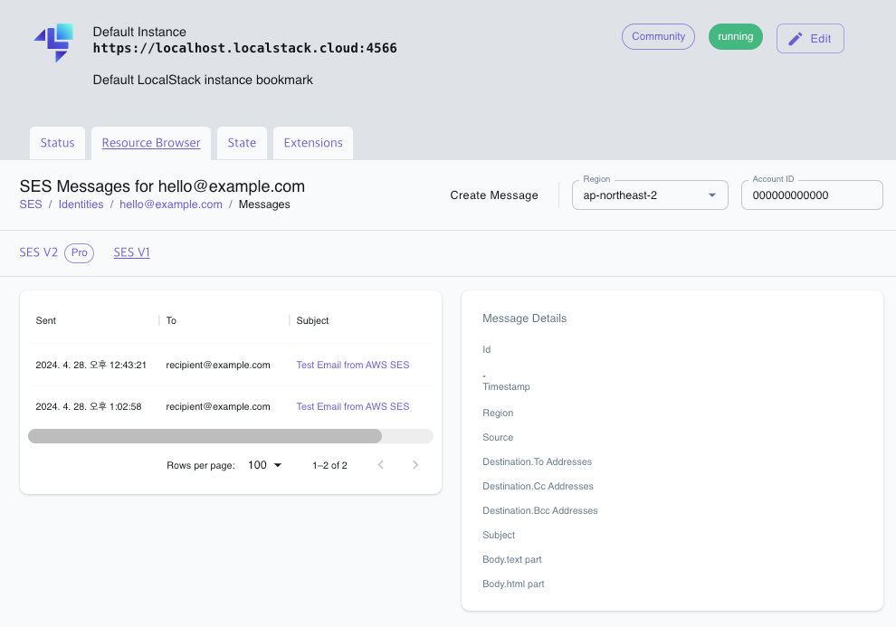 위에 기술된 LocalStack의 SES는 SES V1을 기준으로 하는 것이다. 유료 플랜을 결제하면 SES V2를 사용할 수 있고 SMTP를 연동하여 실제 이메일 전송도 할 수 있는 것으로 보인다.