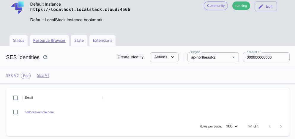 송신 이메일을 “hello@example.com”으로 설정하는 명령어이며 성공한 경우 https://app.localstack.cloud/에서 다음과 같이 등록된 송신 이메일을 확인할 수 있게된다.