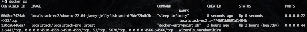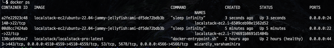 dab0189e0b57 localstack-ec2/ubuntu-22.04-jammy-jellyfish:ami-df5de72bdb3b "sleep infinity" 2 seconds ago Up 2 seconds 0.0.0.0:22->22/tcp, 0.0.0.0:8000->8000/tcp localstack-ec2.i-5237a0d77fdb3f2f9