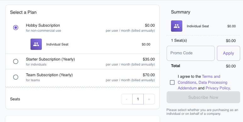 Hobby Plan은 https://app.localstack.cloud/pricing에서 하단에 다음과 같은 UI를 통해서 결제가 가능하다.
