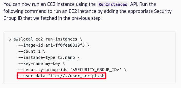 LocalStack의 문서를 보면 "--user-data"라는 옵션을 통해 특정 명령어가 지정된 script.sh 파일이 실행되는 기능이 설명되어있다.