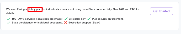 "특정 Plan"이란 Hobby Plan을 뜻한다. "결제"라고 해서 비용이 지출되는 건 아니며 LocalStack 측에서 비상업적 용도로 사용하는 개인에게 좀 더 다양한 기능을 제공하기 위한 용도인 듯하다.