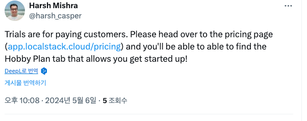 그러다 트위터에 이러한 고민을 올려놨는데 운 좋게 LocalStack 관련 개발자로 보이는 분에게서 Hobby Plan이 있다는 걸 알게 되었다. (참고, Hobby Plan은 Trial과 다르다)