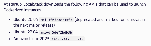 여기서 사용된 image-id는 LocalStack 문서에서 명시된 image-id 중 하나이다. LocalStack 문서에서는 다음과 같이 3가지 image-id를 명시하고 있다.