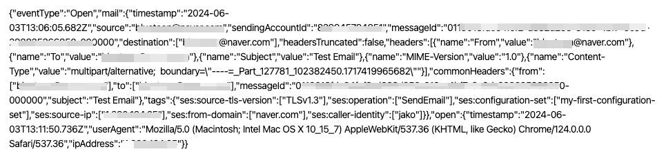 SES로부터 발생한 Event를 SNS를 통해서 받은 내역이다. 해당 메일의 내용은 다음과 같은 Event Message이다.