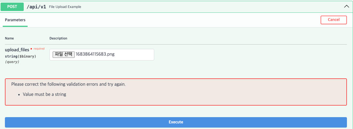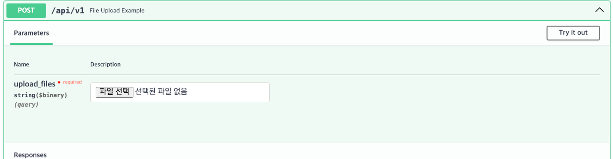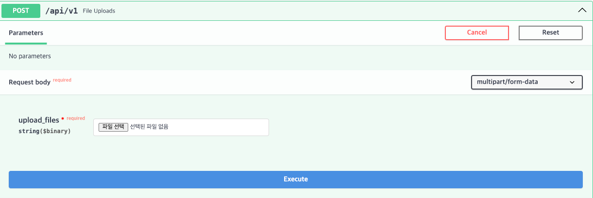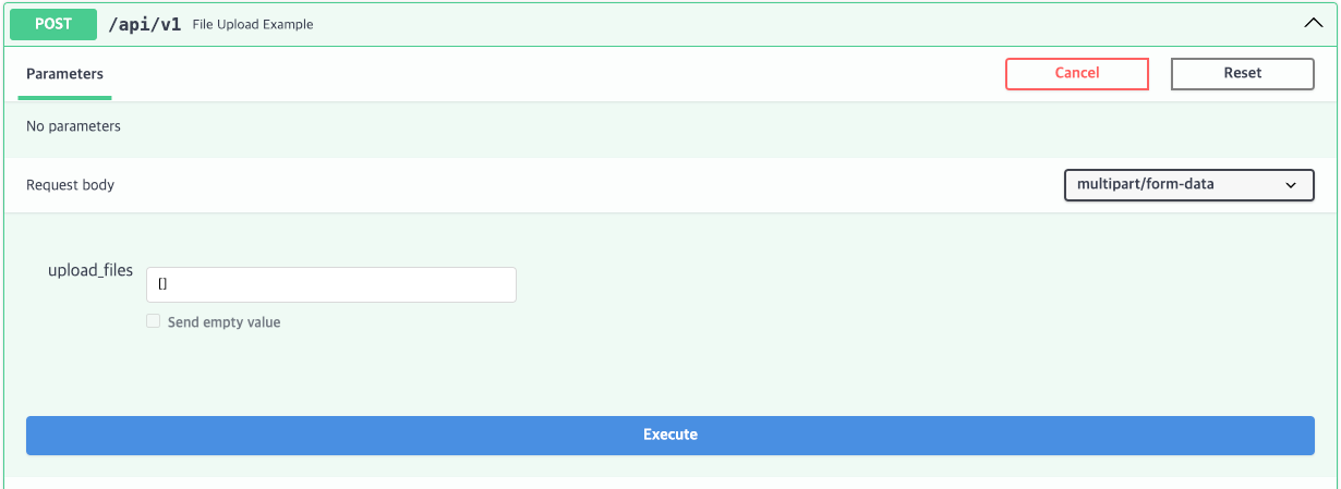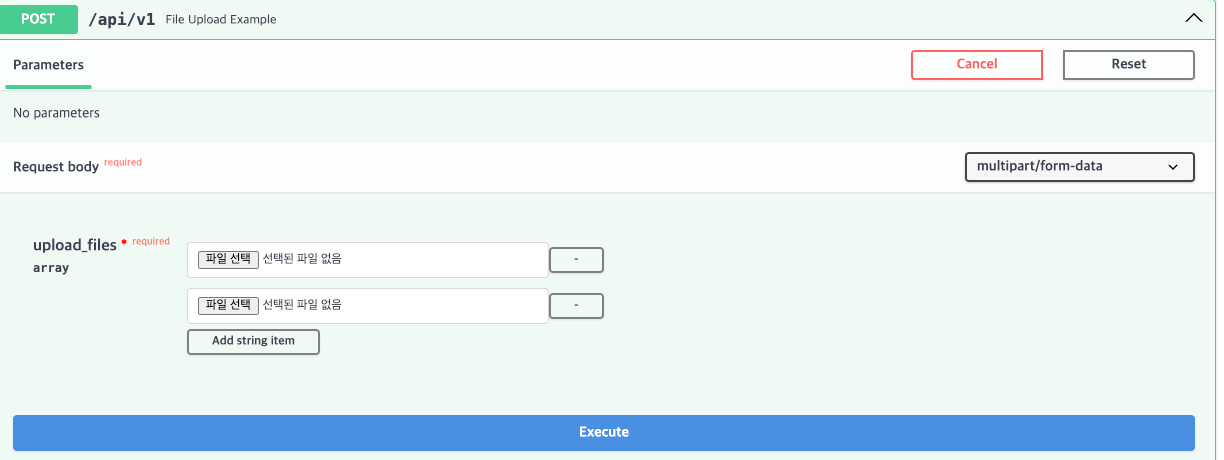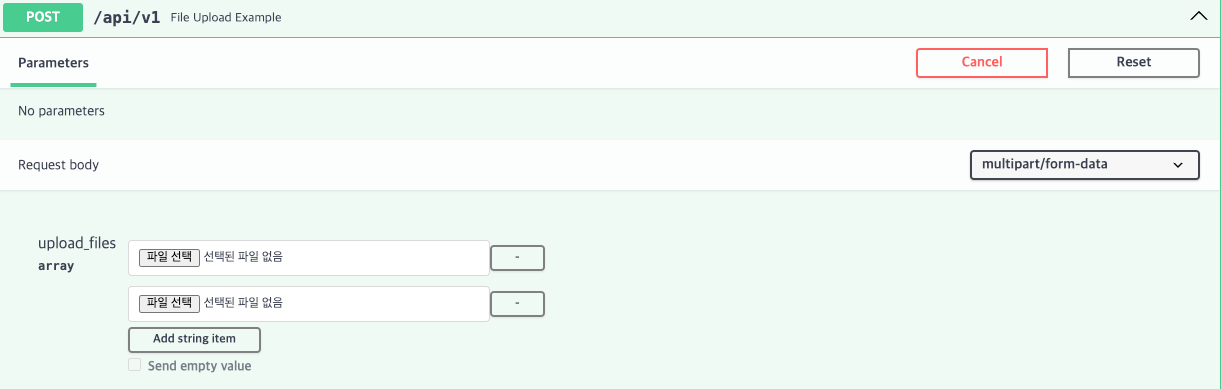 이 경우 Swagger Docs가 다음과 같이 여러 파일을 입력받을 수 있는 UI를 제공할 수 있도록 변경된다.