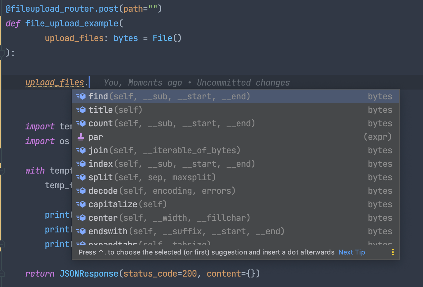 File은 Bytes로 처리되기에 UploadFile 대신 bytes를 사용해 Type Hinting을 걸어줘도 가능하다.