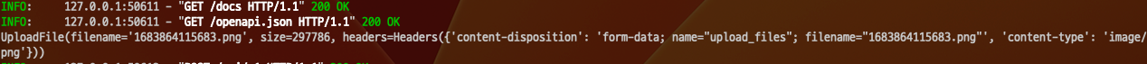 UploadFile과 bytes를 사용하는 방식의 차이점은 UploadFile을 사용하는 쪽이 다루기 더 편하다는 점이다. UploadFile을 사용하는 경우 다음과 같이 Wrapping이 되기 때문에 객체처럼 다룰 수 있게 된다.