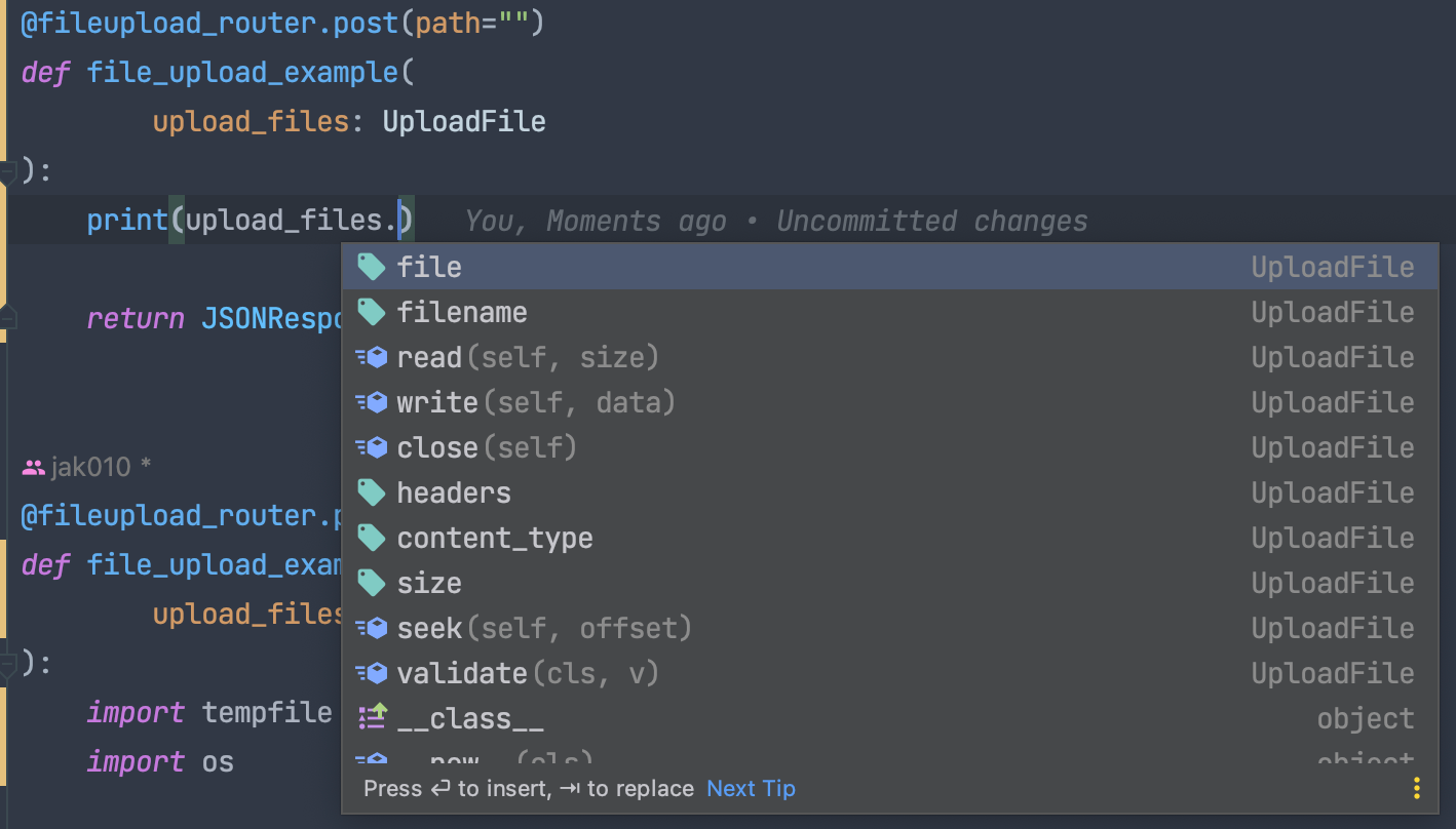 UploadFile은 FastAPI에서 제공해 주는 객체이기 때문에 Type Hinting이 편리하다는 것이 장점이다.