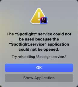 Intelli j 의 "프로젝트 찾기 기능"을 이용 시"Command + Shift + F " 를 눌러서 필요한 코드를 찾곤 한다. 그런데 다음과 같이 SpotLight 와 충돌이 났다면서 Intelli j에서 경고 문구를 띄워주는 현상이 발생했다.