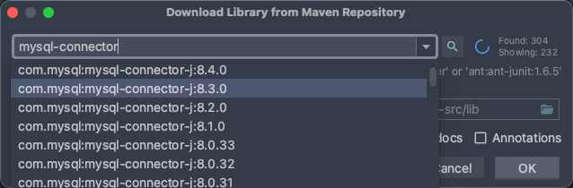 여기 검색창에 다운로드 받고 싶은 Java Library를 입력하면 Maven 저장소로부터 설치 가능한 라이브러리 목록을 보여준다. 예를 들어 db connector를 받고 싶다면 다음과 같이 mysql-connector를 입력해 보자.
