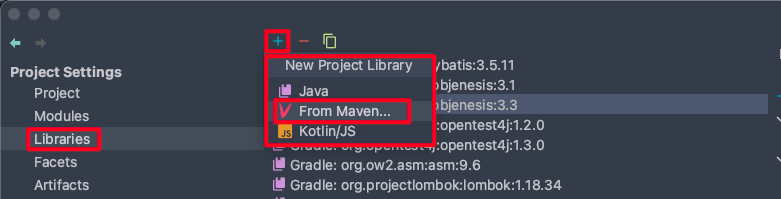 이후 왼쪽 "Libraries" 를 선택하고 오른쪽의 "+"를 클릭하면 From Maven...이라는 선택메뉴가 보인다.