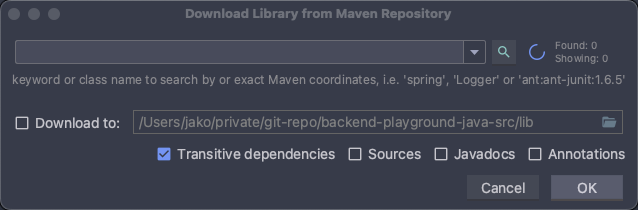 이 글에서 작성된 방식은 intelli-j를 사용해 Java Library를 검색하고 설치하는 방법이다.