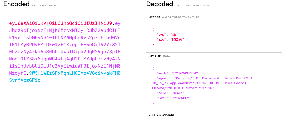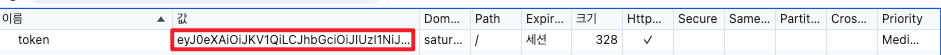 로그인 후 F12를 통해 Cookie에 JWT가 보인다. 이 JWT를 디코딩하면 다음과 같은 내용이 보인다.