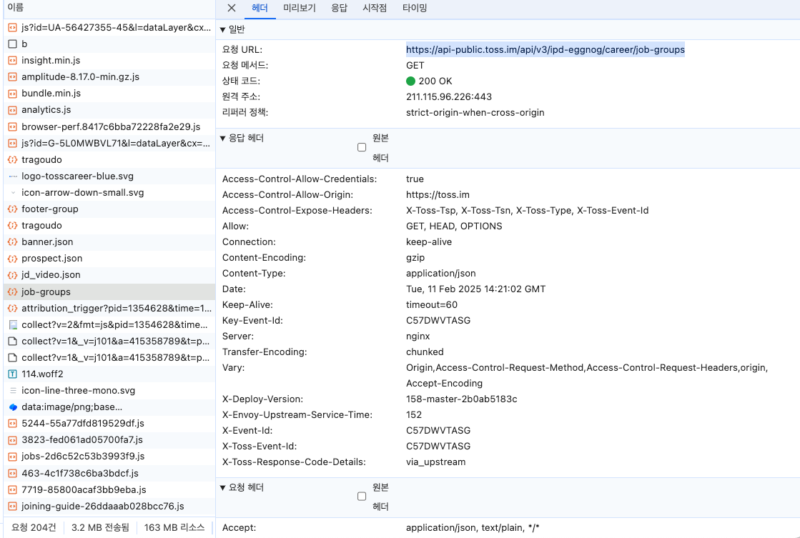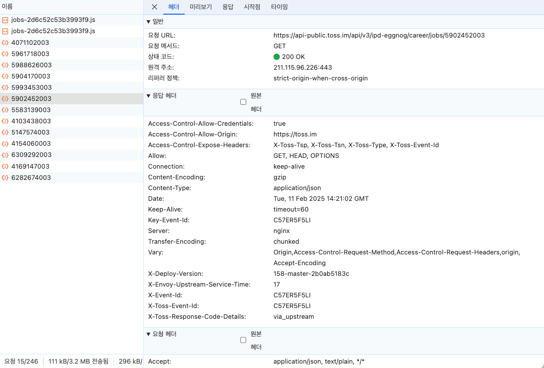 위의 API는 토스의 직군 목록을 반환해 주는 API이기 때문에 직군 목록의 나열만 되어있다. 그러니 계열사 정보를 얻어올 수 없다. 그렇기 때문에 “직군 정보 상세”에 대한 API도 찾아야 하는데 이 API 다음과 같이 호출되고 있었다.