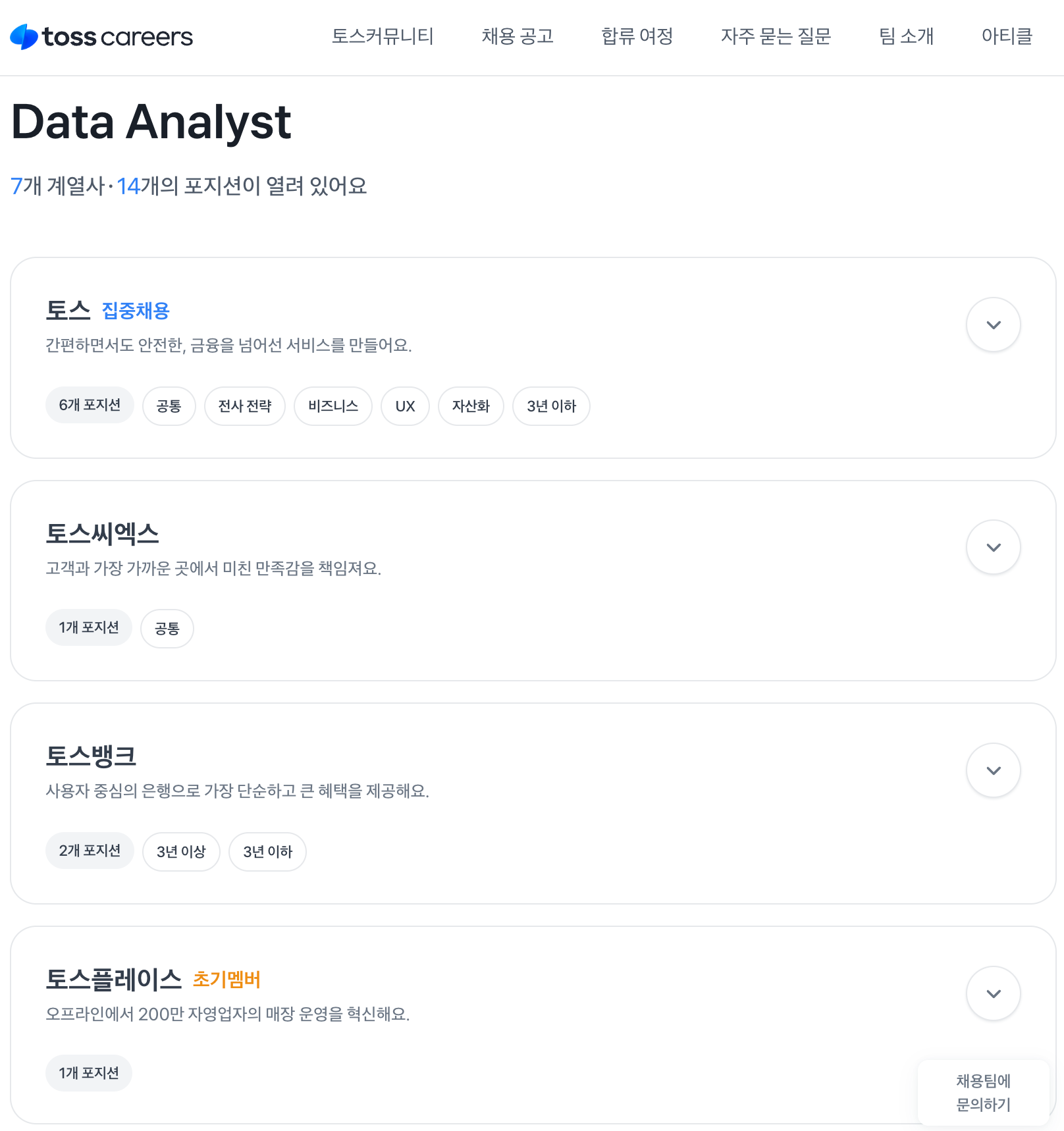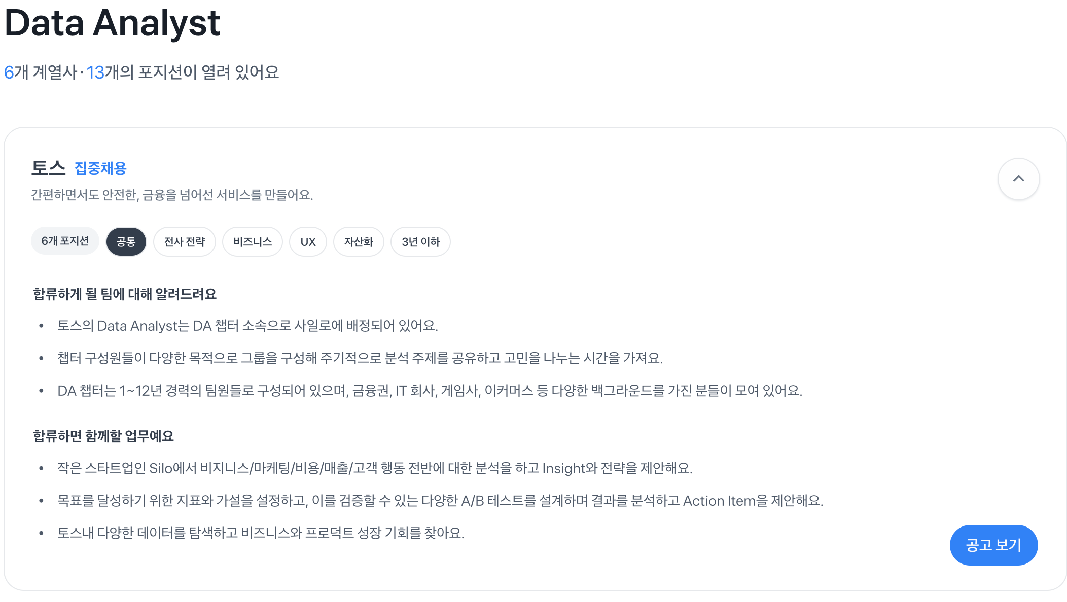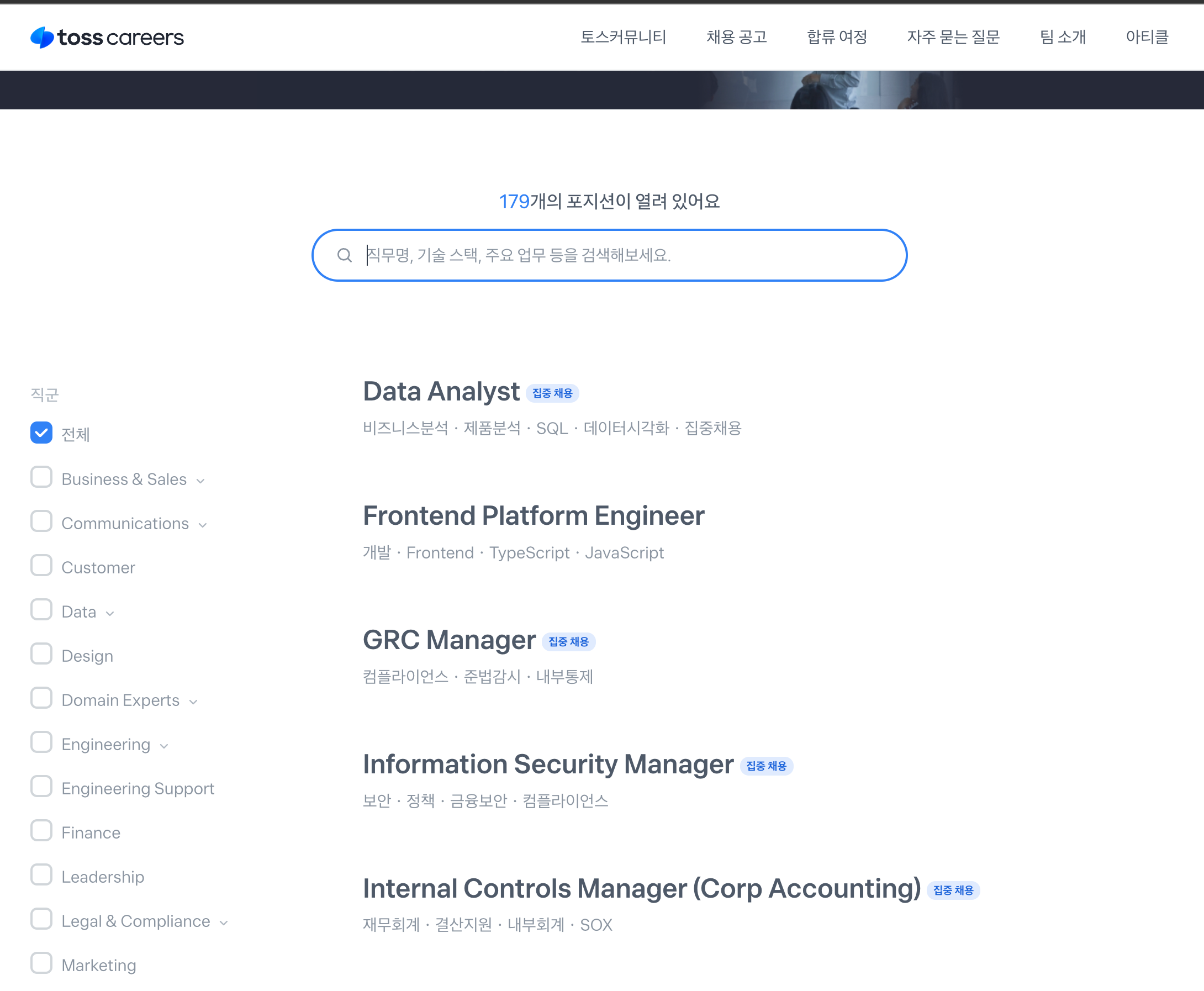 토스의 채용공고 페이지에 접속하면 “계열사”가 아닌 “직군”을 중심으로 구성한 채용공고 페이지가 눈에 띈다.
