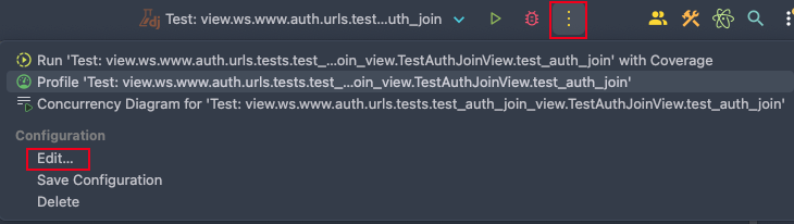 좌측 하단의 "Edit Configuration Templates"를 눌러 Djagno tests 메뉴를 찾는다. 그리고 테스트 대상으로 사용하는 환경 변수들을 저장해두자.