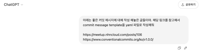 이제 Plugin을 설정했으니 제일 중요한 Commit Messate Template의 내용을 구성할 차례다. 필자의 경우 이러한 부분은 ChatGpt로 좋은 Commit Message에 대해 다루는 링크를 첨부한 뒤 yaml 파일로 작성해 달라고 요청했다.