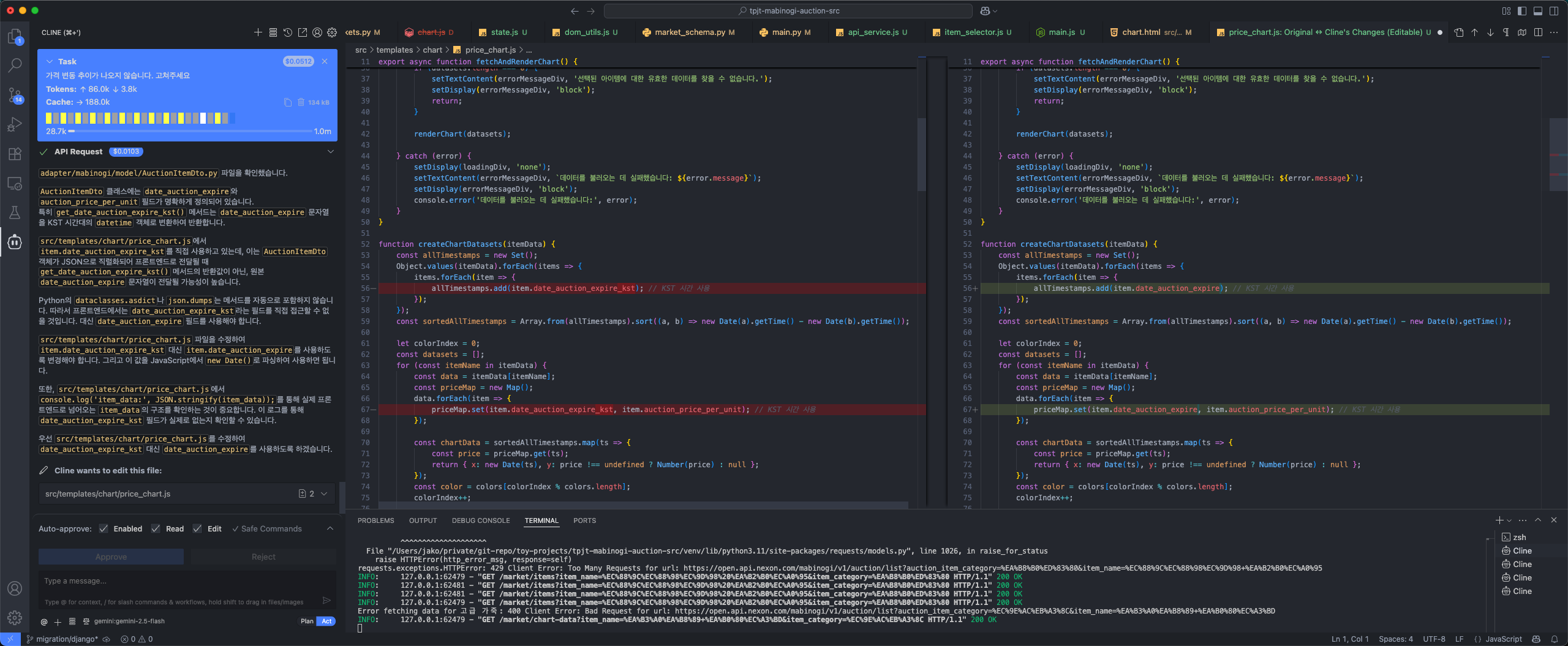 전체적으로 코딩을 수행하는 환경에 대해 변화가 일어났음이 체감이 된다. Visual Code + Cline + Gemini를 사용하기 전의 코딩 방식은 많은 정보와 맥락 속에서 “내가 필요한 것을 찾아서 사용”해야 되는 느낌이었다면 상술한 도구들을 사용하면 “필요한 게 뭐니까 대신 좀 해줘”라는 방식인 듯싶다.