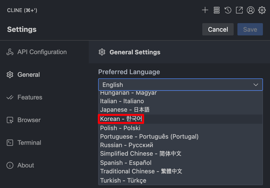 Cline을 통해 Gemini AI에게 Prompt를 날리고 결과를 받아보면 답변이 영어로 출력이 된다. 이는 Preferred Language 설정이 "한국어"로 되어 있지 않아 발생하는 문제이다.