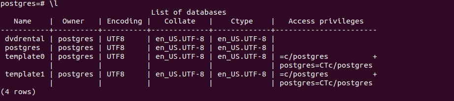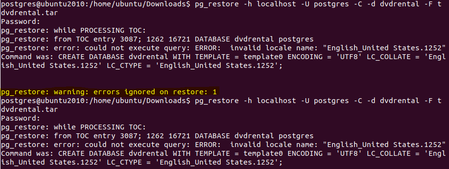 postgres@ubuntu2010:/home/ubuntu/Downloads$ pg_restore -h localhost -U postgres -C -d dvdrental -F t dvdrental.tar