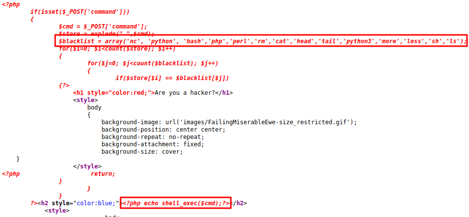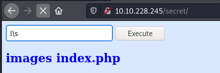 명령어 사이에 역 슬래쉬(\)를 입력해 주었더니 성공했습니다. 이후 images, index.php가 나오는 걸 확인할 수 있는데 images는 gobuster를 이용했을 때 접근 가능한 경로였음을 확인했으므로 넘기고 "c\at index.php"를 입력하고 페이지 소스 보기로 index.php를 읽어봅시다.