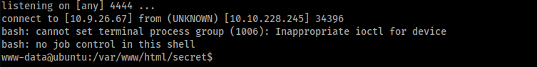 Reverse Shell을 얻기 위해 위와 같은 과정대로 진행해봅시다. shell.sh 파일을 만들어 bash Reverse Shell 내용을 써주고 저장한 뒤 간단한 서버를 만들어서 대기하고 입력 폼에 하단의 curl 명령어를 이용해 대상 서버에 shell.sh를 다운로드하게 하고 이름을 bash로 저장해준 뒤 포트 하나를 열어서 대기해줍시다. 위와 같은 과정을 수행하면 아래와 같이 Connection이 맺어집니다.