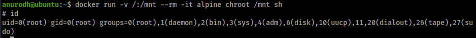패스워드는 base64로 디코딩을 해주면 얻을 수 있으며 이 정보를 가지고 ssh로 접속 시 anurodh의 계정으로 쉘을 얻을 수 있고 id 명령어 입력해 권한을 살펴보면 docker에 대한 id도 가지고 있습니다.