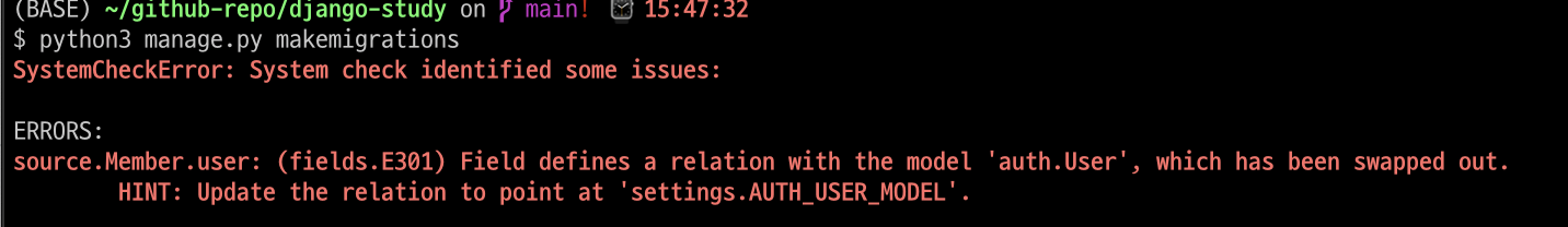 AbstractBaseUser를 상속해 makemigrations를 하던 도중 다음과 같은 에러 납니다.
