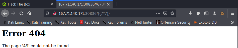 접속하면 Flask/Jinja2라고 힌트를 주고 있습니다. SSTI를 이용해야 되는 문제인 거 같습니다. {{7*7}} 넣음으로써 SSTI가 가능한지 확인해봅시다.