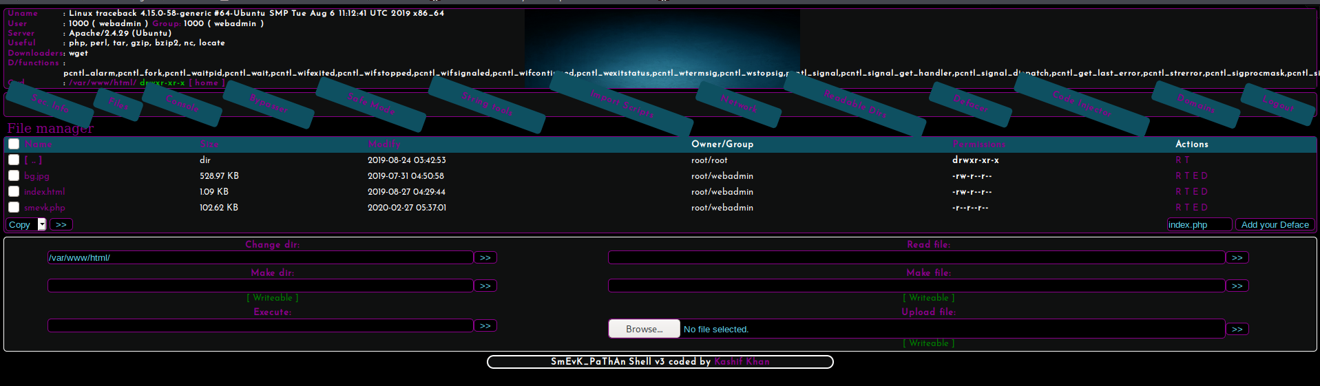 해당 저장소에서 받은 디렉터리 안에 여러 php 파일이 포함되어 있고 이 파일들을 이용해 Request 한 파일이 해당 서버에 존재하는 파일인지 알 수 있는 스크립트를 작성해 수행한 결과 smevk.php 파일이 Response 됩니다.