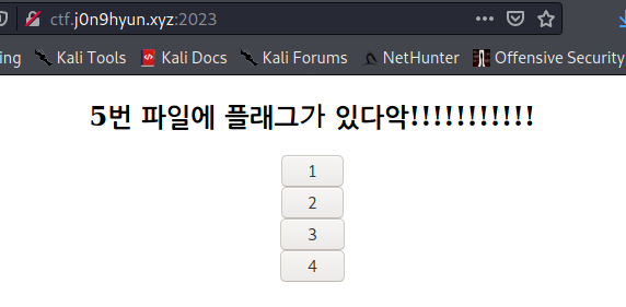 5번 파일에 플래그가 있다고 나온다. 각 버튼마다 1,2,3,4가 나오는데 클릭해보면 Get 방식으로 'http:// ~:2023?id=1' 이런 식으로 넘어가는 걸 알 수 있다. 즉 id에다가 5를 넣어서 요청하면 flag가 나온다.