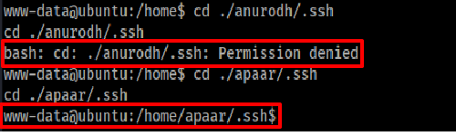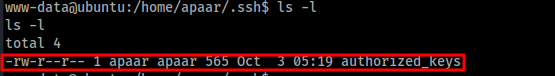 뒤에 .pub 가 붙은 파일의 내용을 /home/apaar/. ssh의 authorized_keys에 내용 덮어 씌우자.하지만 권한이 없으므로 authorized_keys에 내용을 덮어씌울순 없다. jakpentest.tistory.com/73?category=846041 이 항목을 참조해 apaar로 USER Escalate를 수행한 후 시도하자.