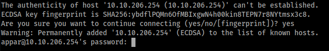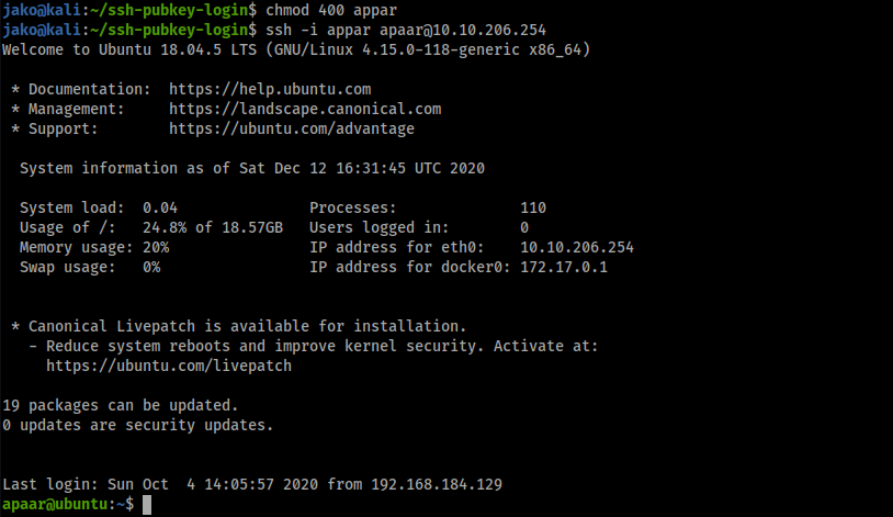 보이는 것과 같이 apaar의 패스워드를 요구하는 중이다. 다음은 공개키를 authorzied_keys에 덮어 씌우고 로그인한 경우이다.