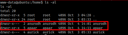 나타나 있는 것처럼 계정이 www-data이며 이는 시스템에서 로그인에 쓰이는 계정 이름은 아닐 것이다. 리눅스에서 /home 밑에는 유저 디렉터리가 존재한다. 이 위치에서는 현재 시스템에서 로그인 가능한 계정의 정보를 얻을 수 있다. (꼭 그런 것만은 아니지만..)
