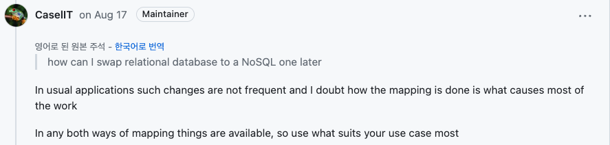 그러나 지금은 Application 안에서 Entity와 ORM Model은 앞서 언급했듯 "관심사의 분리" 그리고 "역할"의 분리를 적용해야 한다는 측면이 강하다고 생각한다. 궁극적으로 DataBase가 변경되어도 웬만해서는 사용할 수 있는 코드를 작성하는 것을 지향하고 있기 때문이다.