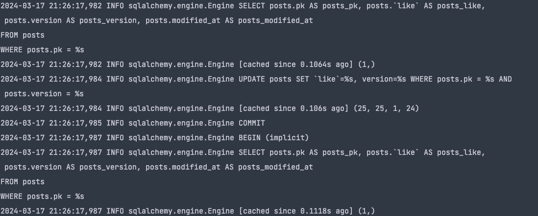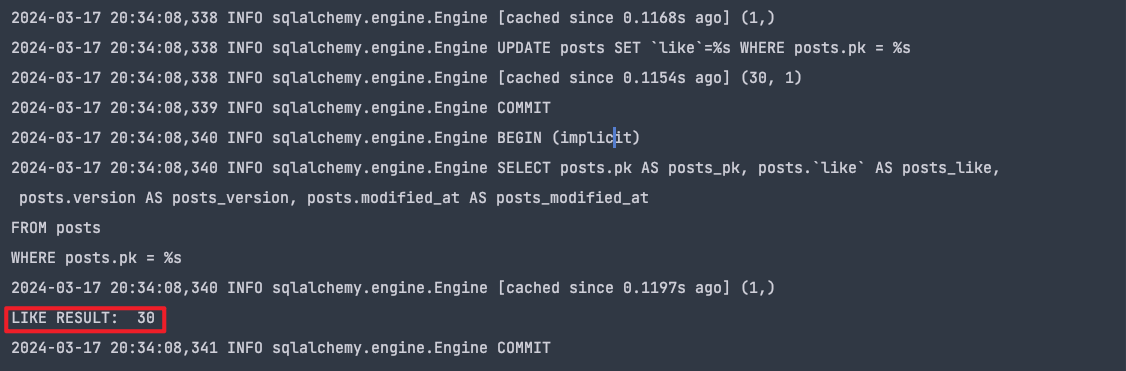 SQLAlchemy의 Query 로그를 살펴보면 실행된 SQL에 “FOR UPDATE”가 붙어있는 것을 확인할 수 있으며 like column의 결과도 각각 50인 것을 확인할 수 있다.