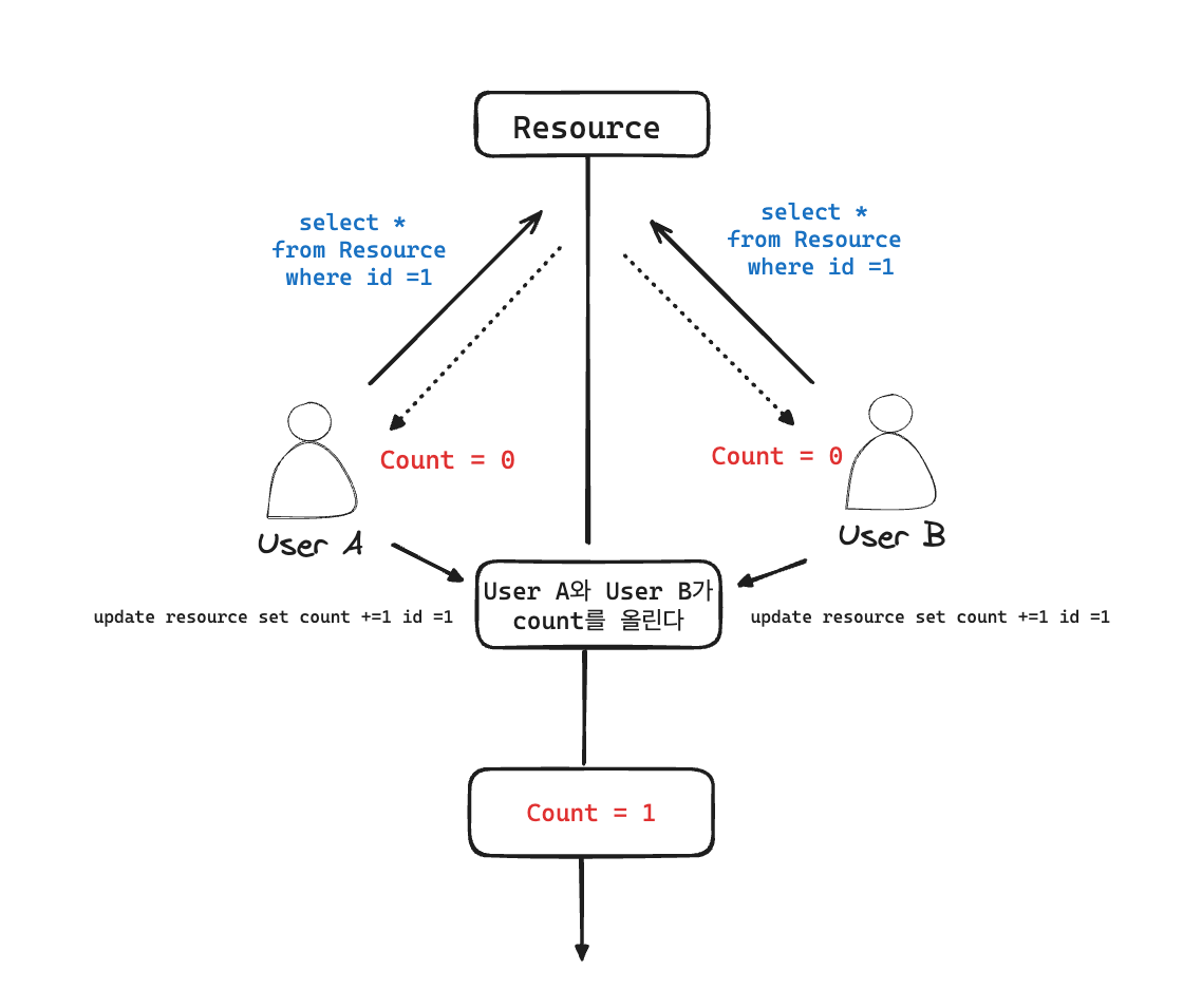 위와 같은 시나리오에서는 사용자 A, B가 Resouce를 읽어(Read), Count를 올리고(Modify), 이를 저장(Save)하는 것을 표현한다. 사용자 A, B가 공유 Resouce에 Count를 올리는 것이기 때문에 Count는 결과적으로 2가 되어야 하지만 1이 돼버리는 것이 문제인 상황이다.