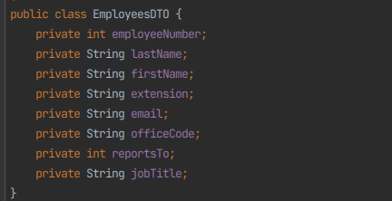 위의 테이블은 MySQL에서 제공하는 샘플 스키마 중 classicmodels DB의 employees 테이블이다. 필드에 정의된 레코드들을 Java로 가져다 쓰려면 어떻게 해야 할까? 단순히 이 테이블에 있는 모든 데이터를 가져오는 쿼리를 날려서 사용할까? 비용이 너무 크고 소모적이라 생각된다. 그래서 이 테이블에 대응하는 다음과 같은 class를 만들어 사용한다.