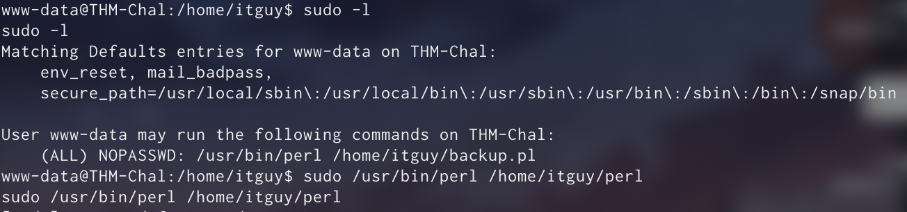 이후 backup.pl을 실행 시키키 위해 sudo -l 명령어를 통해 perl이 sudo로 실행 가능한지 확인해봅시다.