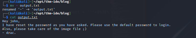 drac이란 유저가 john에게 보내는 메시지이고 john의 패스워드가 Reset 되었으니 default password로 로그인하라는 내용이다. 잘 기억해두자.